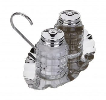 Silver Plated Leaf Design Base with Side Handle, 2 Glass Cruet Bottles with Silver Plated Tops