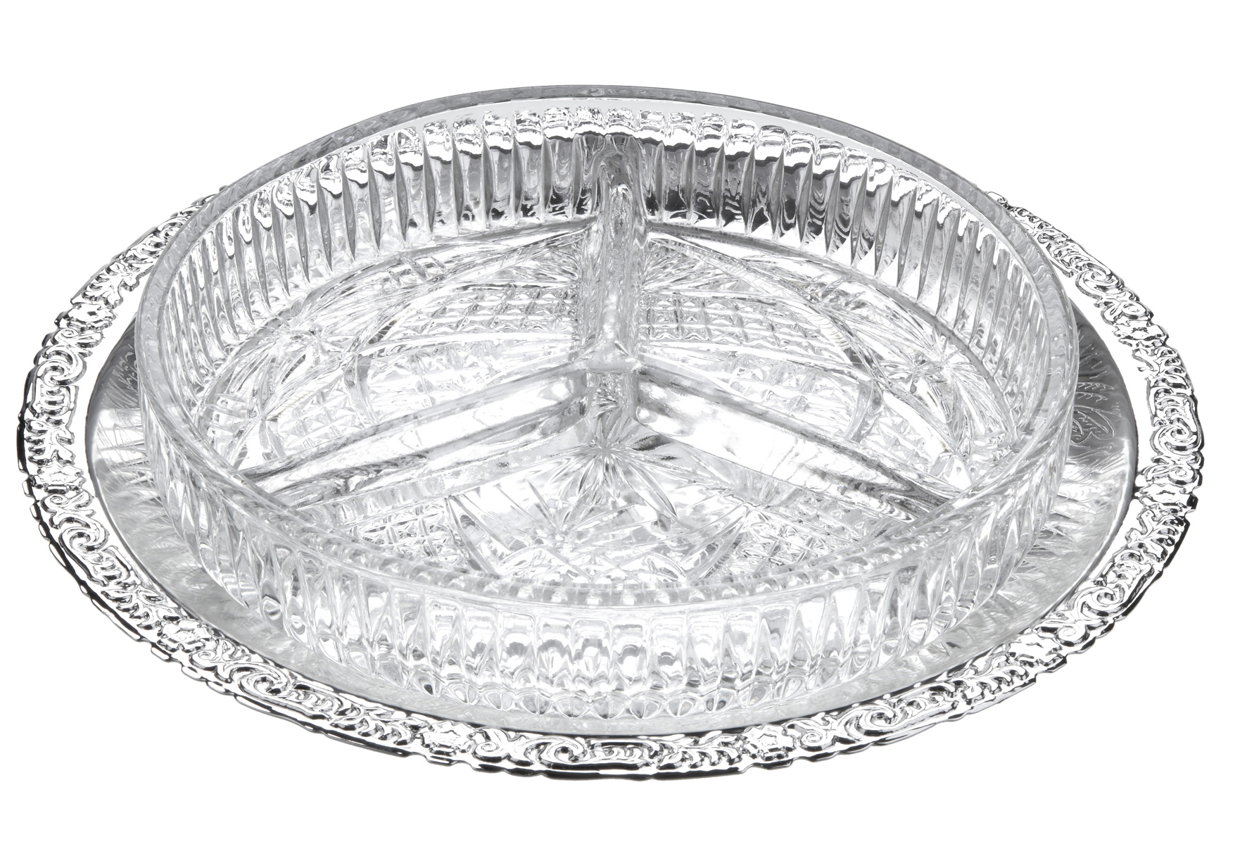 Silver Plated Floral Edged recessed Tray with 3 Division Round Patterned Hors D'Ouevre Glass