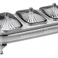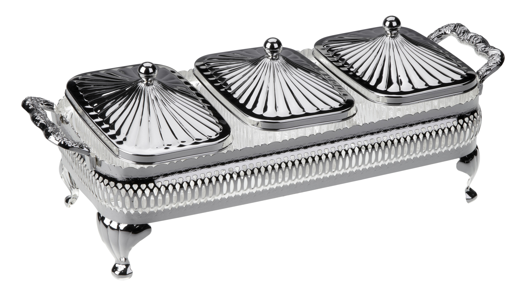 Silver Plated Gallery Frame with Legs with 3 Decorative Lids, and 3 Oblong Patterned Glass Dishes.