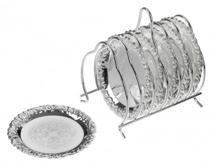 Silver Plated Holder with 6 Floral Edged Drinks Coasters.