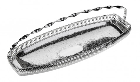 Silver Plated Galleried Sandwich Tray with Swing Handle and Ball Feet.