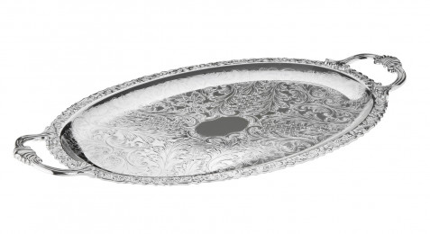 Silver Plated Oval Tray with Diecast Handles, Floral edge and recessed base.