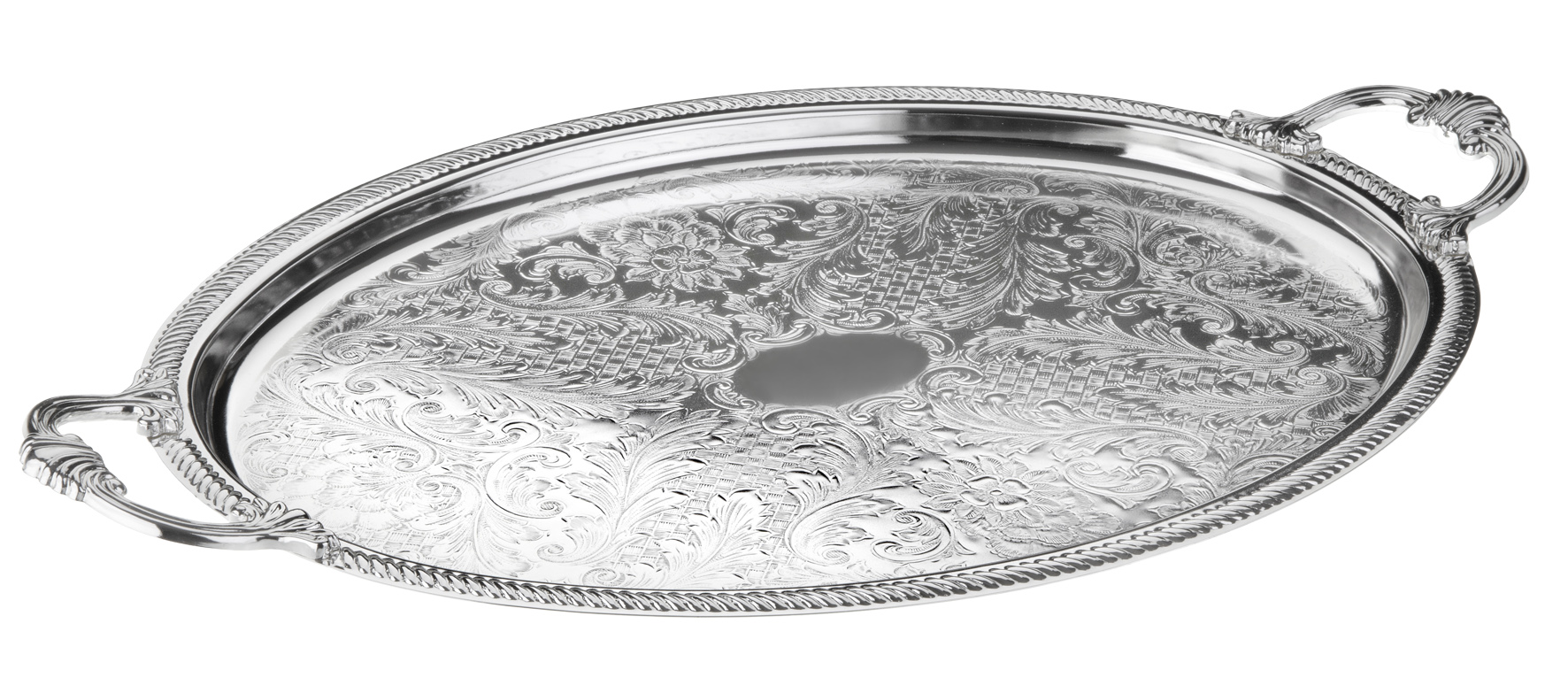 Silver Plated Large Oval Tray with Diecast Handles, Gadroon "style" edges and shallow recess.